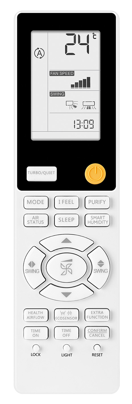 Control remoto HQ-HJ con función de encendido/apagado, selector de modo o función de la unidad interior, cambio de velocidad del ventilador, configuración de la oscilación del aparato y ajuste de temperatura. Es el mando a distancia de serie de la solución residencial Expert y Flexis Plus.