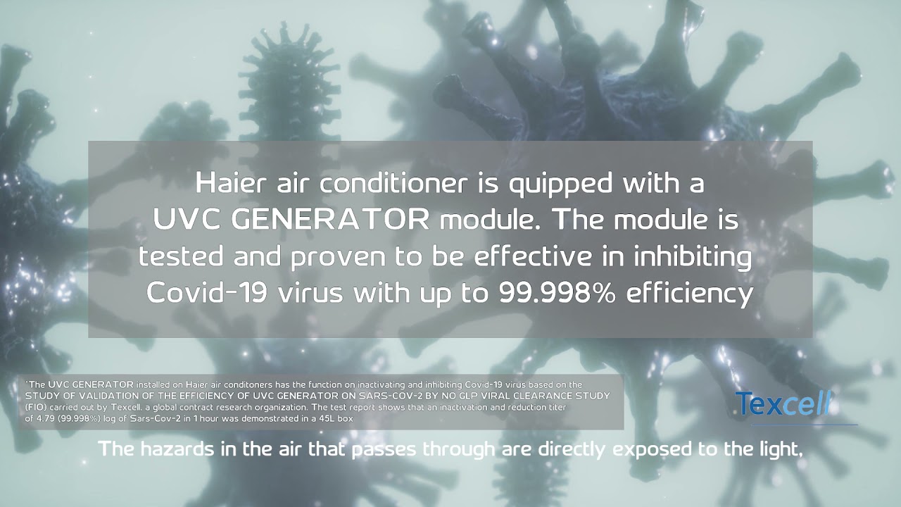 O gerador UVC da Haier recebeu um Certificado de Inativação do Novo Coronavírus, do líder Texcell S,A, um laboratório independente de testes virulógicos na França. A organização de pesquisa global concluiu que o gerador Haier UVC inativa 99,998% do novo coronavírus (SARS-CoV-2) nas suas instalações de teste seladas.